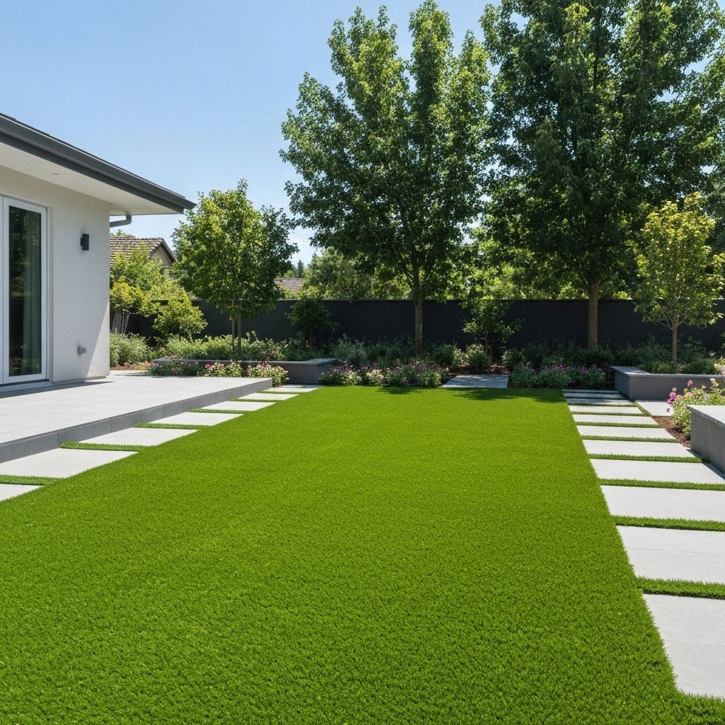 Professional landscape design and installation services including artificial turf, shrub planting, and complete landscape construction.
